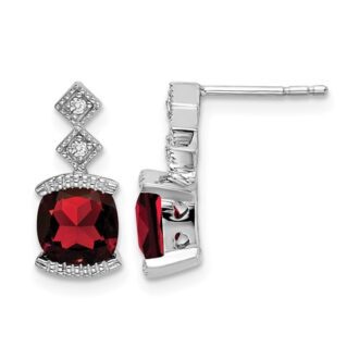 14k White Gold 6mm Cushion Garnet and .04 carat Diamond Post Earrings