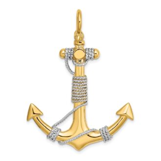 14K 3-D Large Anchor Wrapped Rope Charm Yellow Gold with Rhodium Plating