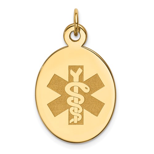 Material: Primary – Purity:14K|Finish:Polished|Length of Item:26 mm|Charm/Element Length:23 mm|Charm/Element Width:16.5 mm|Feature:Solid|Material: Primary:Gold|Width of Item:16.5 mm|Engravable:Yes|Product Type:Jewelry|Jewelry Type:Pendants & Charms|Sold By Unit:Each|Pendant/Charm Type:Medical Alert|Texture:Textured|Material: Primary – Color:Yellow|Bail Length:4 mm|Feature 2:Polished Back|Relative Size:Medium