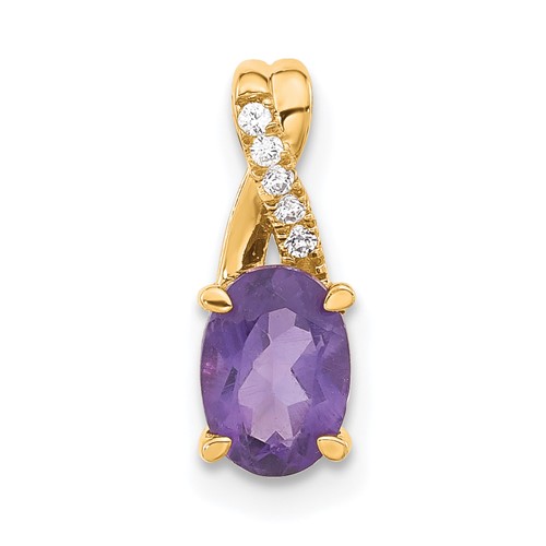 Material: Primary – Purity:14K|Finish:Polished|Stone Type_1:Amethyst|Stone Type_2:Diamond|Stone Color_1:Purple|Stone Quantity_1:1|Stone Quantity_2:5|Length of Item:14.3 mm|Stone Setting_1:4 Prong|Stone Weight_1:0.725 ct|Stone Weight_2:0.006 ct|Stone Clarity_2:I2 (A)|Charm/Element Length:14.3 mm|Charm/Element Thickness:5 mm|Charm/Element Width:6.25 mm|Feature:Will Not Fit Omega|Manufacturing Process:Casted|Material: Primary:Gold|Completeness:Complete (all stones included)|Stone Shape_1:Oval|Stone Shape_2:Round|Stone Size_1:7 x 5 mm|Stone Size_2:1.1 mm|Stone Treatment_1:Heating|Width of Item:6.25 mm|Product Type:Jewelry|Jewelry Type:Pendants & Charms|Sold By Unit:Each|Pendant/Charm Type:Birthstone|Gender:Women’s|Material: Primary – Color:Yellow|Stone Creation Method_1:Natural|Stone Creation Method_2:Natural|Birthstone Month_1:(02) February
