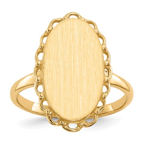 Material: Primary – Purity:14K|Finish:Polished & Brushed|Band Width:2 mm|Size (Minimum):4|Size (Maximum):8|Material: Primary:Gold|Sizeable:Yes|Engravable:Yes|Product Type:Jewelry|Jewelry Type:Rings|Sold By Unit:Each|Gender:Women’s|Texture:Satin|Profile Type:Open Back|Material: Primary – Color:Yellow|Ring Type:Signet Ring|Ring Top Length:17.5 mm|Ring Top Width:11 mm