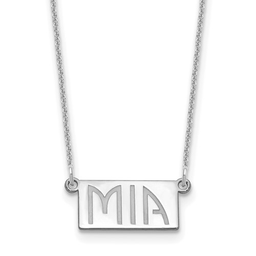 Material: Primary – Purity:14K|Finish:Polished|Length of Item:7.83 mm|Plating:Rhodium|Chain Length:18 in|Chain Type:Cable|Clasp /Connector:Lobster|Feature:Personalized|Manufacturing Process:Lasered|Material: Primary:Gold|Width of Item:15.4 mm|Product Type:Jewelry|Jewelry Type:Necklaces|Sold By Unit:Each|Necklace Type:Name / Initials|Pendant/Charm Type:Personalized|Gender:Unisex|Material: Primary – Color:White
