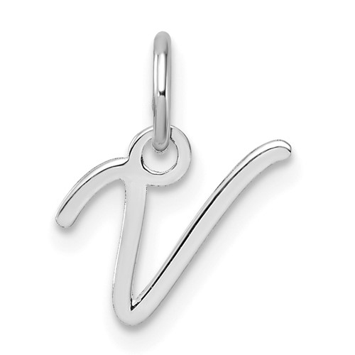 Material: Primary – Purity:14K|Finish:Polished|Length of Item:13.2 mm|Plating:Rhodium|Charm/Element Length:11.4 mm|Charm/Element Thickness:0.4 mm|Charm/Element Width:8.2 mm|Feature:Personalized|Material: Primary:Gold|Engravable:Not Recommended|Product Type:Jewelry|Jewelry Type:Pendants & Charms|Sold By Unit:Each|Pendant/Charm Type:Themed|Gender:Unisex|Profile Type:Flat Back|Bail Width:0.9 mm|Material: Primary – Color:White|Bail Length:5.8 mm|Feature 2:Satin Back|Plating Color:Silver Tone|Relative Size:Large|Letter:V|Bail (Inside) Length:2.4|Bail (Inside) Width:2.4|Bail (Inside) Width U/M:mm|Bail (Inside) Length U/M:mm