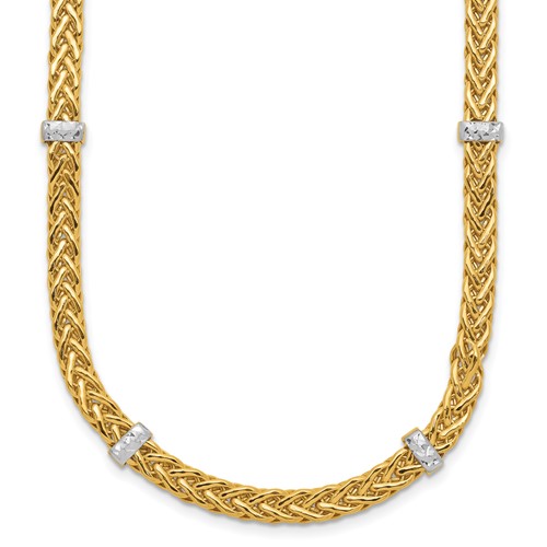 Material: Primary – Purity:14K|Finish:Polished|Length of Item:18 in|Material: Accents:Rhodium|Material: Accent Color 1:White|Chain Length:18 in|Chain Type:Fancy|Chain Width:4.75 mm|Clasp /Connector:Lobster (Fancy)|Material: Primary:Gold|Width of Item:4.75 mm|Product Type:Jewelry|Jewelry Type:Necklaces|Sold By Unit:Each|Necklace Type:Fancy Necklace|Gender:Women’s|Texture:Diamond-cut|Material: Primary – Color:Yellow