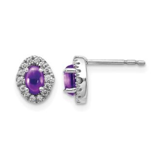 14k White Gold 5×3 Oval Amethyst Cabochon and .16 carat Diamond Halo Post Earrings