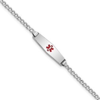 14k White Gold Medical Semi-Solid Chain/Solid Plate 20x5mm Soft Diamond Shape Centered Red Enamel Cuban Link 7 inch ID Bracelet